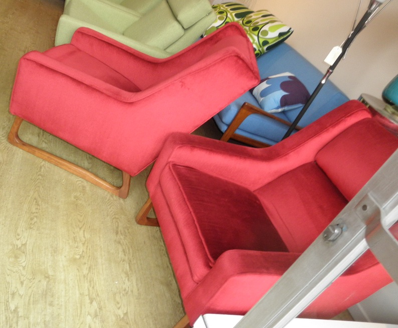This sled based retro lounge suite consists of a long three seater couch with nice comfortable seating position on a teak sled base and two stunning armchairs with a great winged side profile . It looks to be a Danish deluxe design judging by the sled base which was a common feature on their mid 1960s to early 1970s pieces which they borrowed from Gerald Easden. The whole suite has been recently redone in the very retro ruby red velour and is very firm and solid. We got this suite at a great price and as we don’t need to do anything to it we are selling it for a bargain price so be quick -you would pay more on ebay.